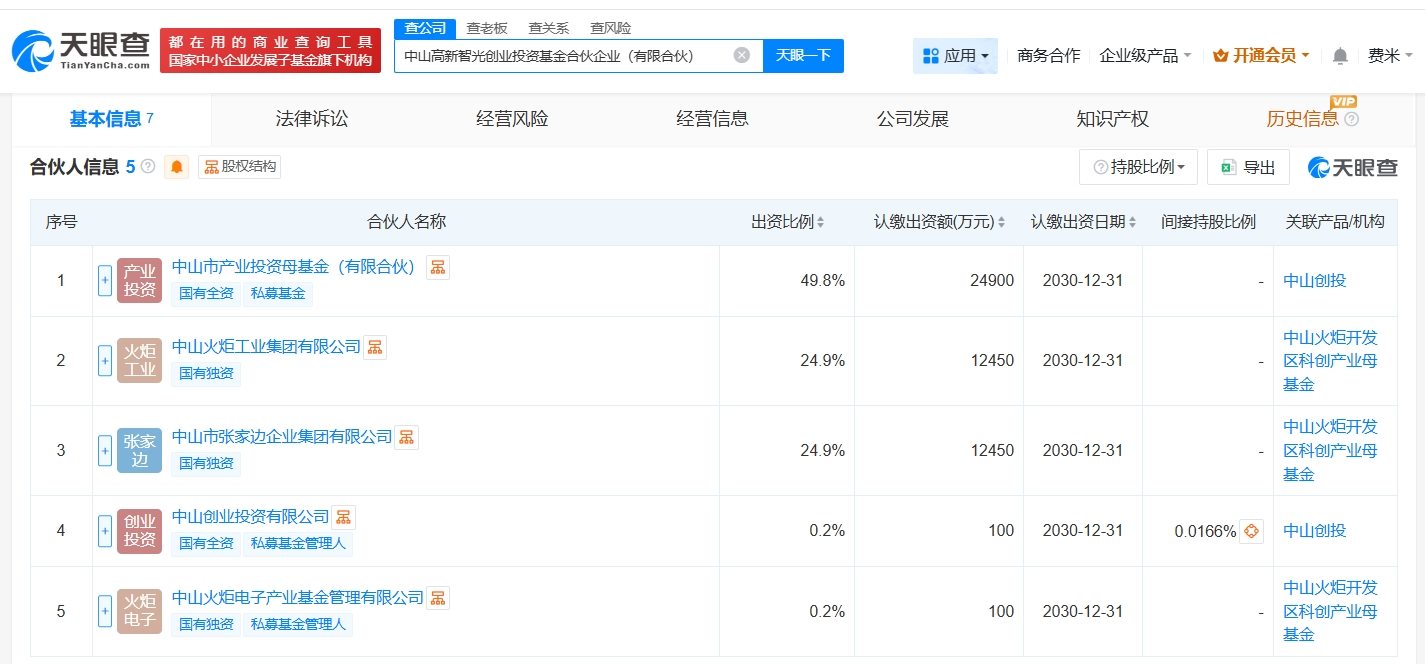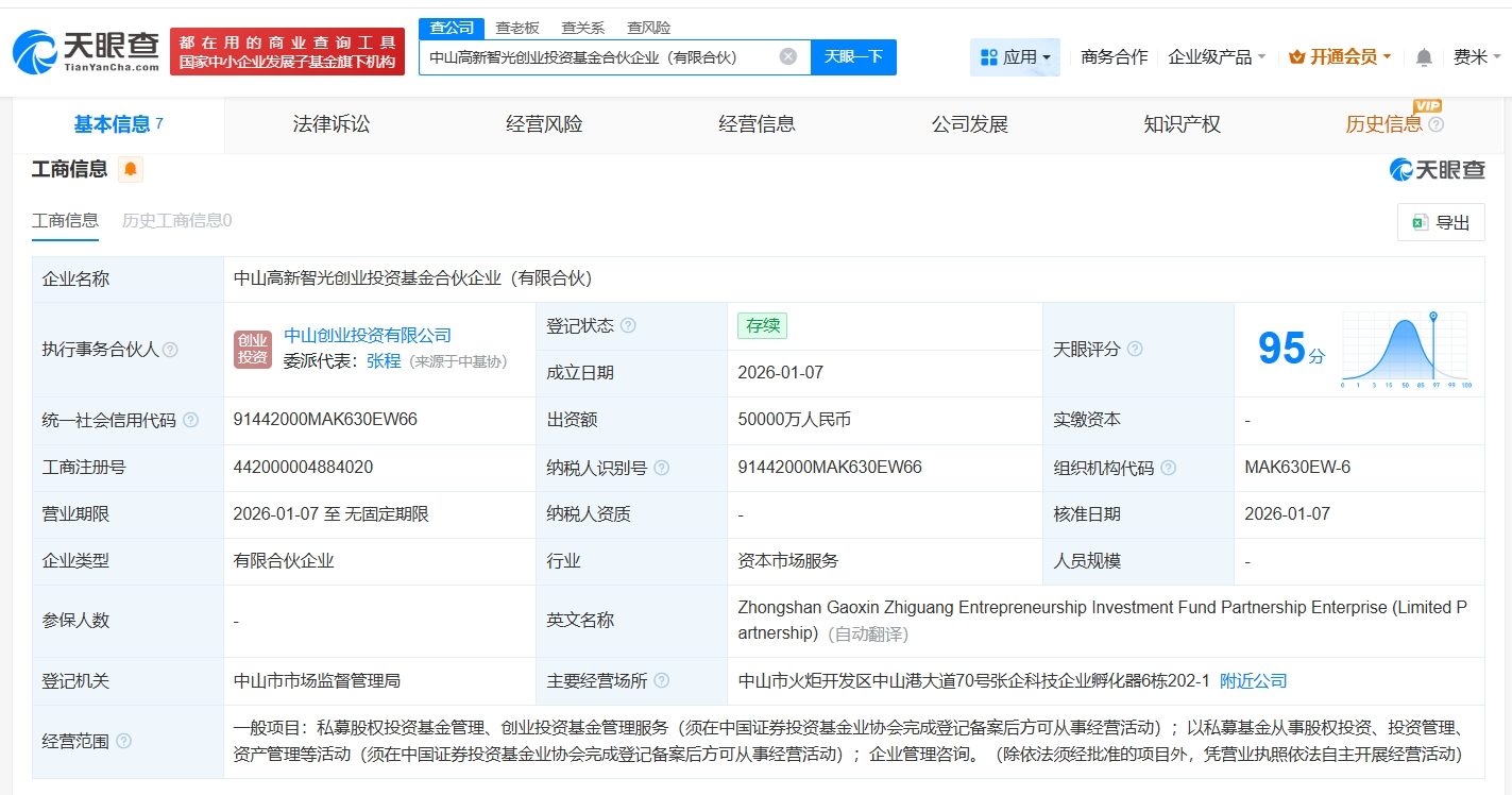 天眼查工商信息显示,近日,中山高新智光创业投资基金合伙企业(有限合伙)成立,执行事务合伙人为中山创业投资有限公司,出资额5亿人民币,经营范围为私募股权投资基金管理、创业投资基金管理服务,以私募基金从事股权投资、投资管理、资产管理等活动,企业管理咨询。合伙人信息显示,该基金由中山市产业投资母基金(有限合伙)、中山火炬工业集团有限公司、中山市张家边企业集团有限公司等共同出资。