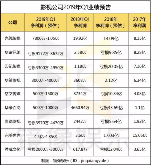 近日,多家影视公司披露了2019年Q1业绩预估报告,几家影视公司一季度盈利全都大幅下滑。光线传媒Q1业绩预估盈利,但不难看出业绩下滑却较明显,同比下降94.73%—96.09%。据报告,公司净利润同比下降的主要原因是:较2018年Q1非经常性损益大幅减少。