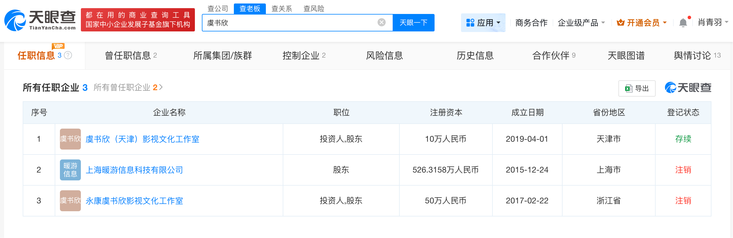 天眼查任职企业信息显示,虞书欣名下关联3家公司,仅虞书欣(天津)影视文化工作室为存续状态,该工作室成立于2019年4月,出资额10万人民币,为虞书欣个人独资企业,经营范围含影视文化艺术活动交流策划、电影、电视剧剧本创作服务、歌曲创作服务等。年报信息显示,该公司2019年至2023年参保人数均为0,2024年华策影视与虞书欣合约到期当年,参保人数增至3人。