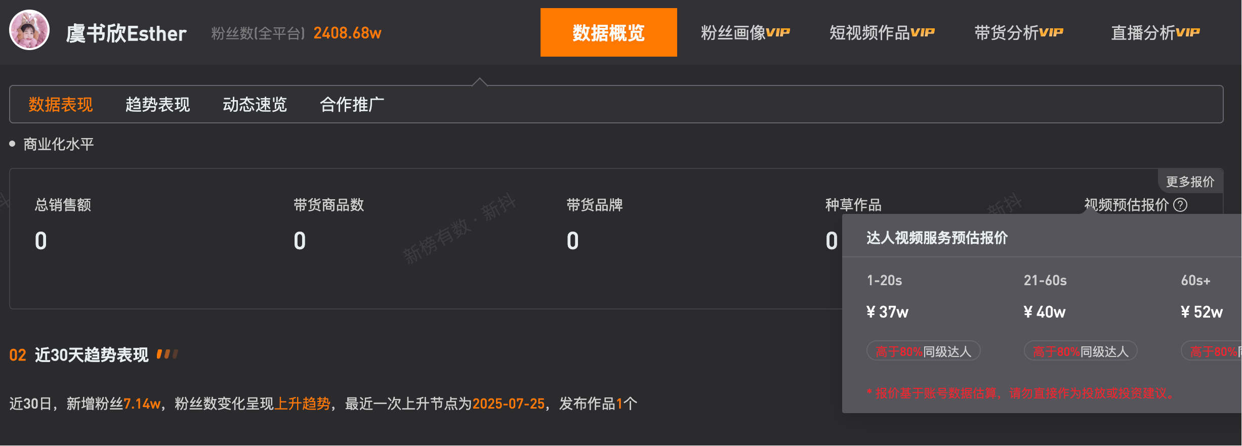 第三方数据显示,虞书欣视频平台账号近30日涨粉7.14万。此外,该账号1-20s视频预估报价为37万,21-60s视频预估报价为40万,60s+视频预估报价为52万。