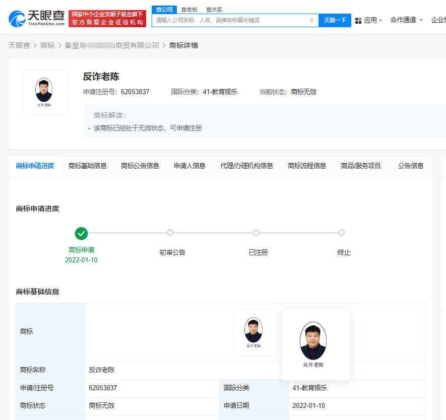 天眼查知识产权信息显示,秦皇岛某商贸公司曾申请注册多枚“反诈老陈”商标,国际分类涉及教育娱乐、广告销售、通讯服务等,当前商标申请均已被驳回,处于无效状态。