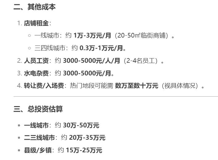 通过询问DeepSeek,其汇总了各级市开一家蜜雪冰城所花费的成本。