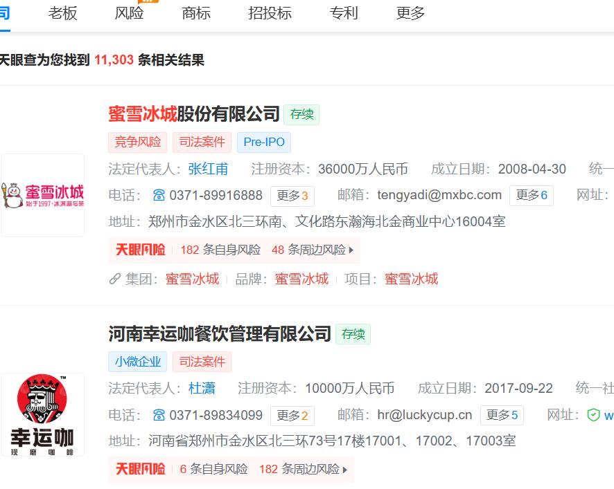 其实蜜雪冰城旗下也有子品牌,那就是幸运咖,在天眼查APP上搜索蜜雪冰城,就会出现幸运咖,显示股东是蜜雪冰城。