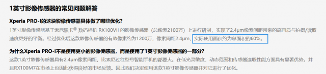在索尼官网的注释中,索尼给出了这样的说明:“实际使用面积约为总面积的60%”。也就是说,“1英寸的大底”只能使用其中的60%,就是用不满。