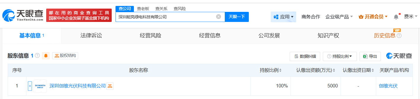天眼查App显示,近日,深圳能亮绿电科技有限公司成立,法定代表人为黄永涛,注册资本5000万人民币,经营范围包括光伏设备及元器件销售、光伏发电设备租赁、光伏设备及元器件制造、蓄电池租赁、电池销售、电池制造等,由深圳创维光伏科技有限公司全资持股。