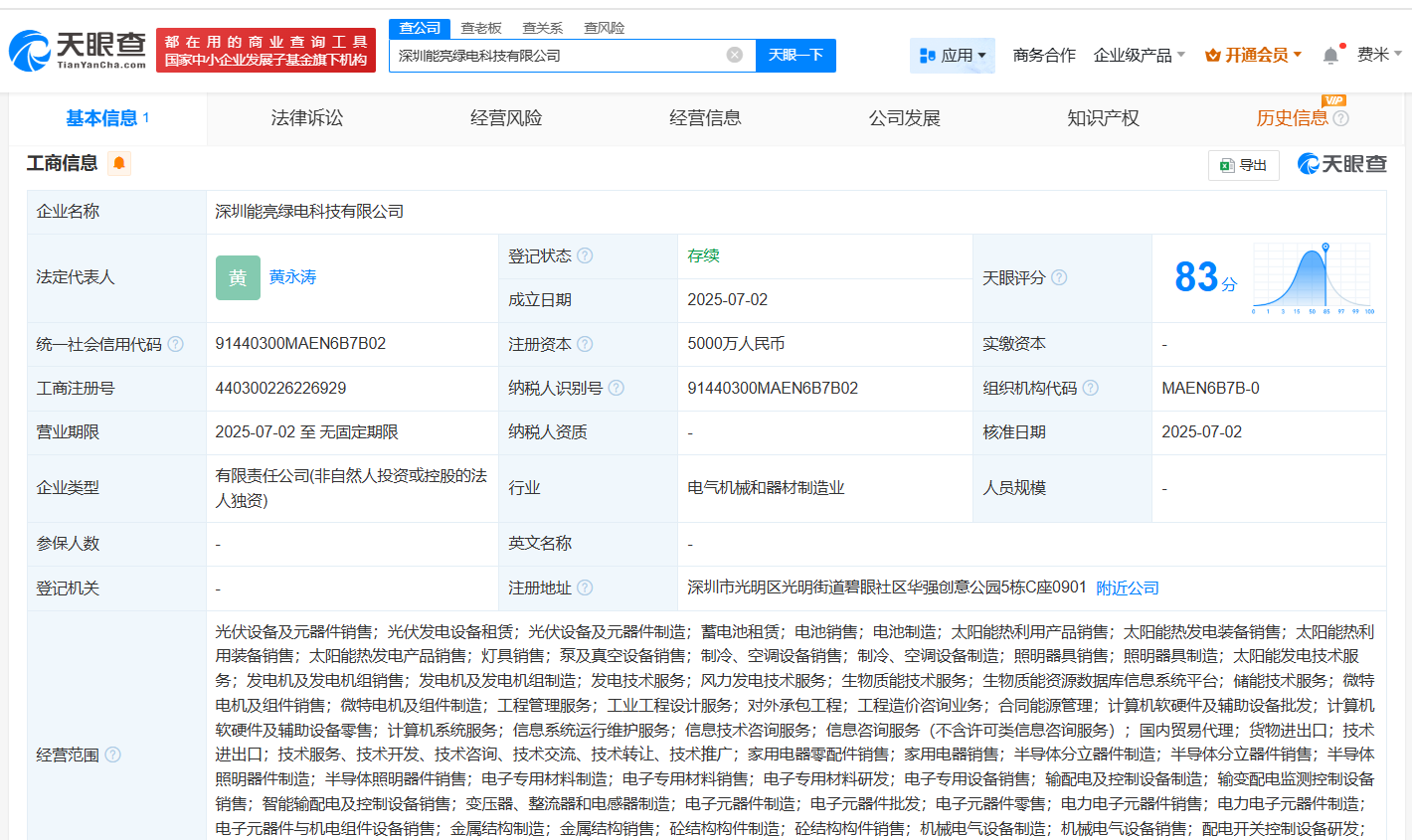 近日,深圳能亮绿电科技有限公司成立,法定代表人为黄永涛,注册资本5000万人民币,经营范围包括光伏设备及元器件销售、光伏发电设备租赁、光伏设备及元器件制造、蓄电池租赁、电池销售、电池制造等,由深圳创维光伏科技有限公司全资持股。
