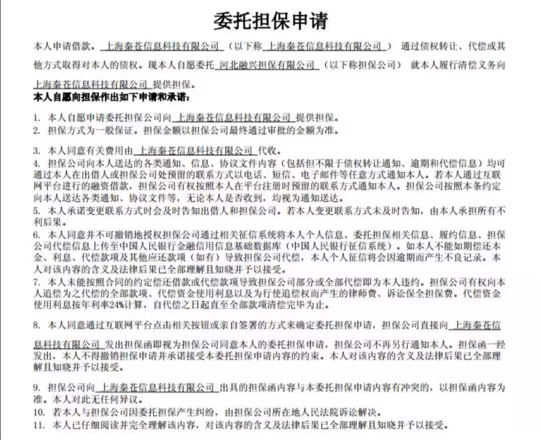 据新金融看点所获的《委托担保申请》显示,秦苍科技通过债权转让、代偿或其他方式取得对借款人债权。借款人自愿委托河北融兴担保有限公司(下称“河北融兴”)就借款人履行清偿义务向秦苍科技提供担保。