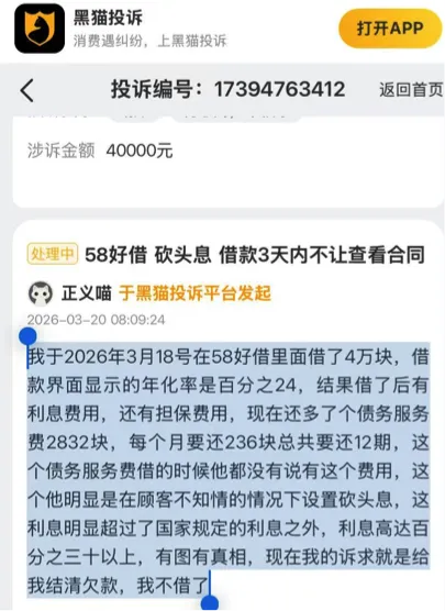 一位用户投诉称,在58好借里面借了4万块,显示的年化率是24%,结果借后除了利息费,还有担保费,现在还多债务服务费2832块,这在借款时平台都没有说。