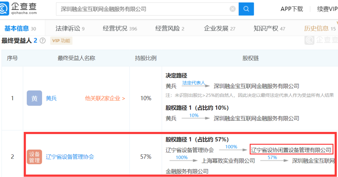 股权穿透后,融金宝控股股东及最终受益人为辽宁省设备管理协会,该协会为一家社会团体,通过100%控股辽宁省设协闲置设备管理有限公司从而实控融金宝大股东上海幂致实业有限公司。