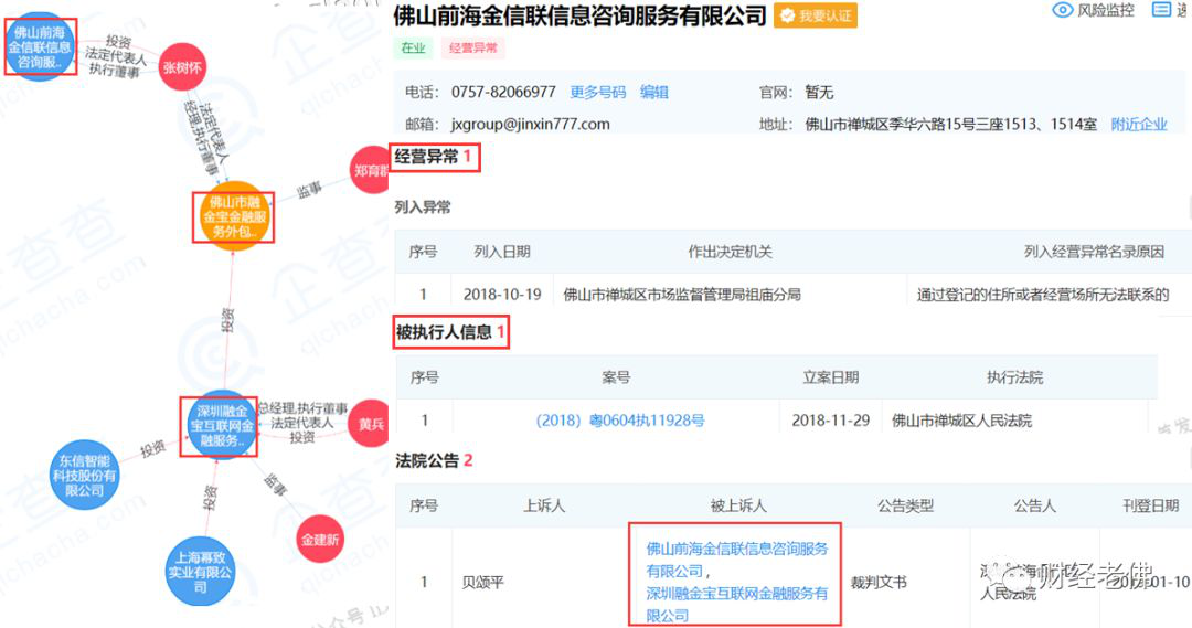 在今年最新的法院公告中,有一家叫佛山前海金信联信息咨询服务有限公司格外令人注意,通过融金宝对外投资企业的关系图谱,我们可以看到佛山前海金信联信息咨询服务有限公司是其对外投资的公司,目前该公司,不仅处于失联状态而且也是有人民法院被执行人信息的老赖。