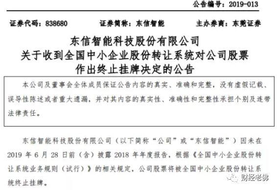 融金宝的股东之一东信智能,由于未能在限期内披露2018年报,被强制从新三板退市。