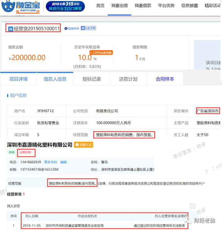 近期,融金宝还被相关媒体曝光标的存在问题,融金宝经营贷201905100011标的显示, 借款人在平台以循环借款12次,累计融资金额320万,通过信息对比验证该借款企业为深圳市嘉源精化塑料有限公司,该公司从2018年11份开始至今失联。