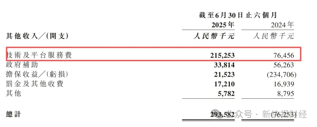 根据维信金科其他收入项目分类,2025年取得技术及平台服务费2.15亿元,同比增长182%,实现翻倍增长。这部分业务在上年同期报告中被细分为会员费、导流费及其他服务费。