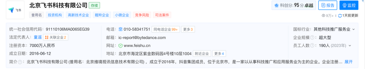 业务的重要性从时间上也看得出来,要知道,天眼查APP显示飞书成立于2016年只比抖音晚了3个月。