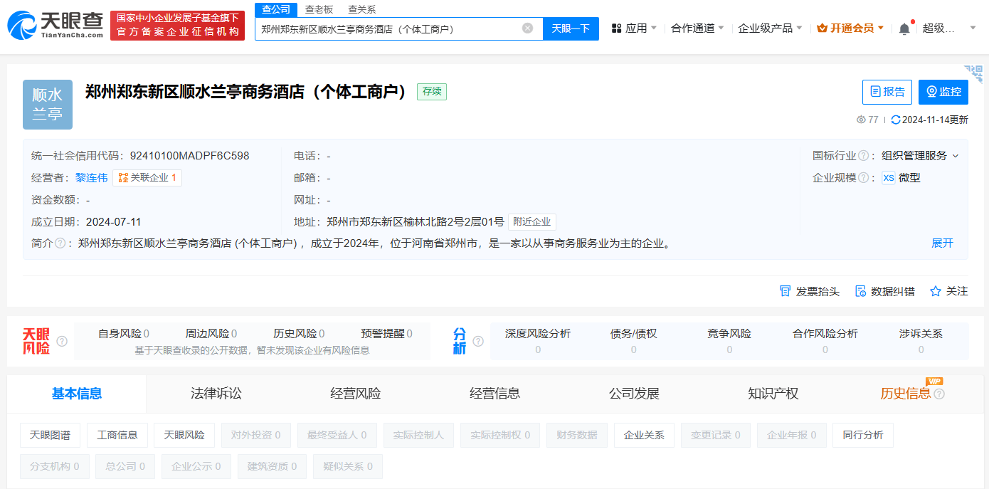 天眼查App显示,郑州顺水兰亭洗浴中心关联的郑州郑东新区顺水兰亭商务酒店(个体工商户)成立于今年7月,经营者为黎连伟,经营范围包括住宿服务、餐饮服务、洗浴服务、酒类经营等。