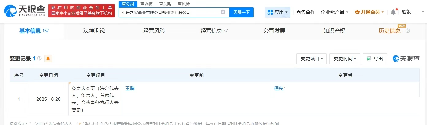 天眼查App显示,近日,小米之家商业有限公司郑州第九分公司发生工商变更,王腾卸任该公司负责人,由程光接任。目前,王腾名下还关联1家小米科技有限责任公司郑州分公司。
