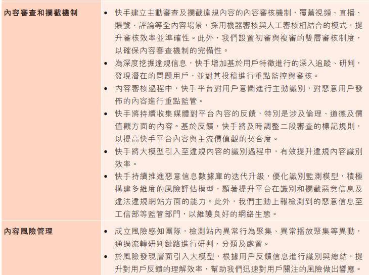 快手也在财报中披露了其内容风险管理机制:公司已经成立了风险感知团队,检测站内异常行为聚集、异常播放聚集等异动,通过流转研判链路进行研判、分类及处置。