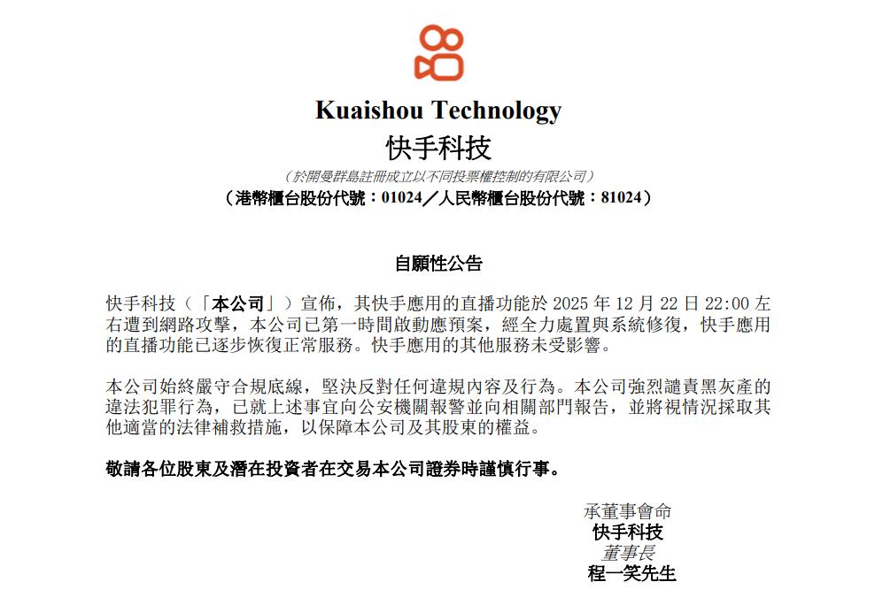 虽然快手在12月23日的回应公告中强调,快手应用的直播功能已逐步恢复正常服务。快手应用的其他服务未受影响。