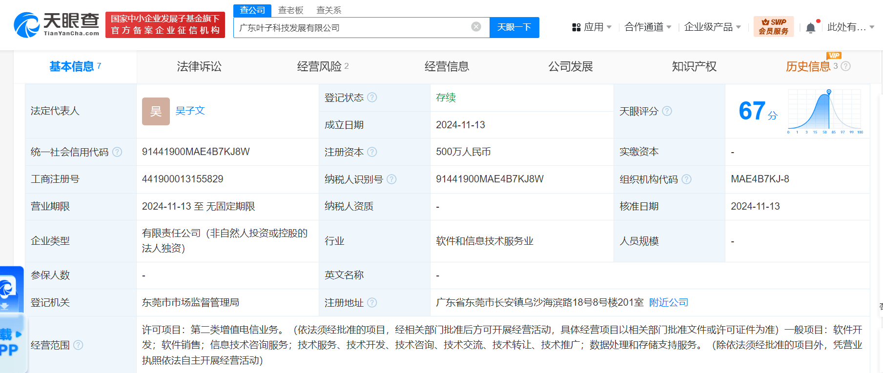 天眼查App显示,近日,广东叶子科技发展有限公司成立,法定代表人为吴子文,注册资本500万人民币,经营范围含软件开发、软件销售、信息技术咨询服务、数据处理和存储支持服务等。