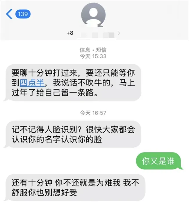 小晴提供的催收信息显示,有个人号码向其发送短信,威胁称“记不记得人脸识别?很快大家都会认识你的名字认识你的脸。”