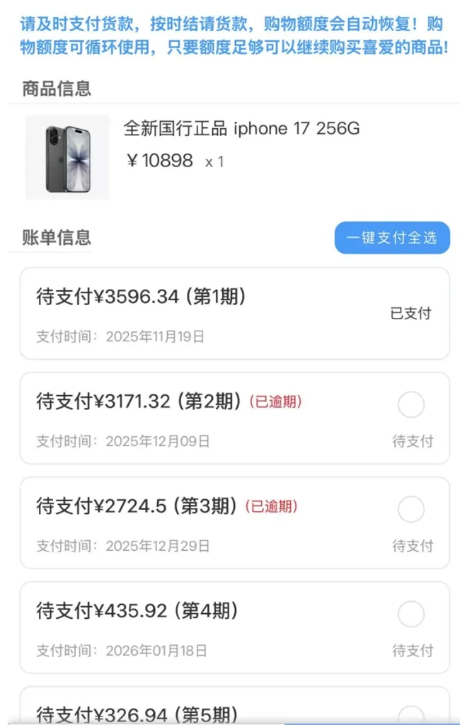 近日,小晴向消费日报记者反映,自己在“鑫米优选”商城用购物额度分期下单了一款iPhone 17 256G的手机,平台售价10898元,但其仅从中介处获得现金4000元。到还款时小晴发现时间间隔很短,前期还款压力大,自己因无力还款导致逾期,目前被平台各种威胁、恐吓中。小晴认为自己遭遇了“套路贷”。