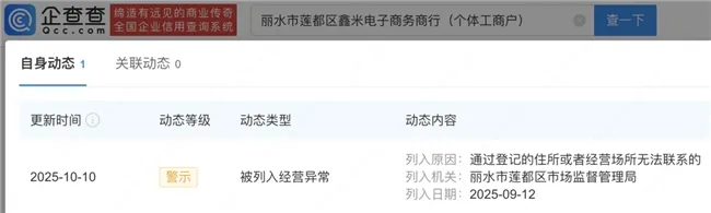 值得一提的是,鑫米电子商行在2025年10月已经被丽水市莲都区市场监督管理局列入异常经营名单,列入原因为“通过登记的住所或者经营场所无法联系。”