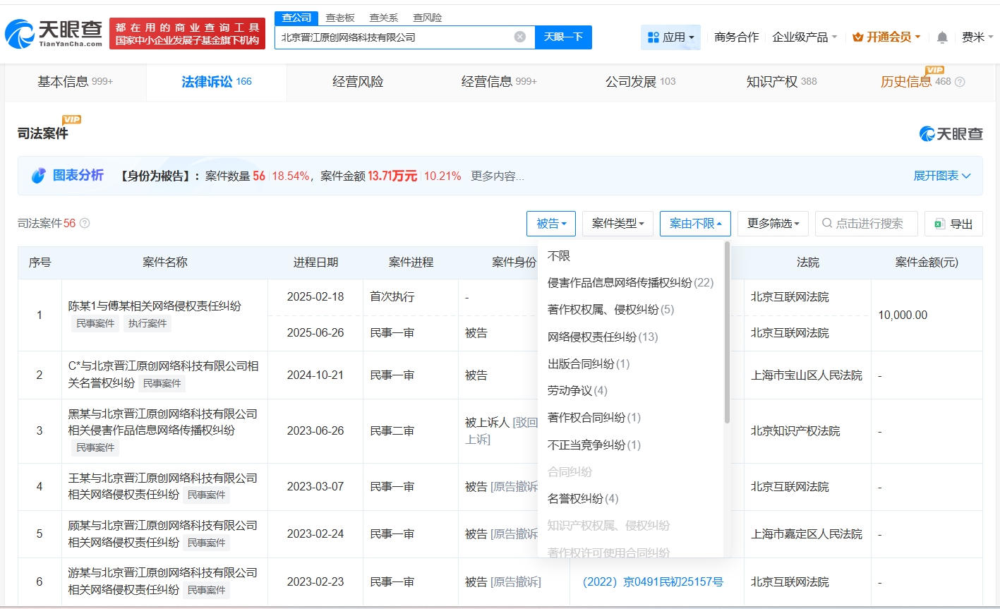 天眼查App显示,晋江文学城关联公司北京晋江原创网络科技有限公司成立于2006年3月,法定代表人为胡慧娟,注册资本1110万人民币,经营范围包括软件开发、互联网销售、计算机软硬件及辅助设备零售等,由上海宏文网络科技有限公司、黄艳明、刘旭东共同持股。法律诉讼信息显示,该公司曾因网络侵权责任纠纷、名誉权纠纷等被起诉。