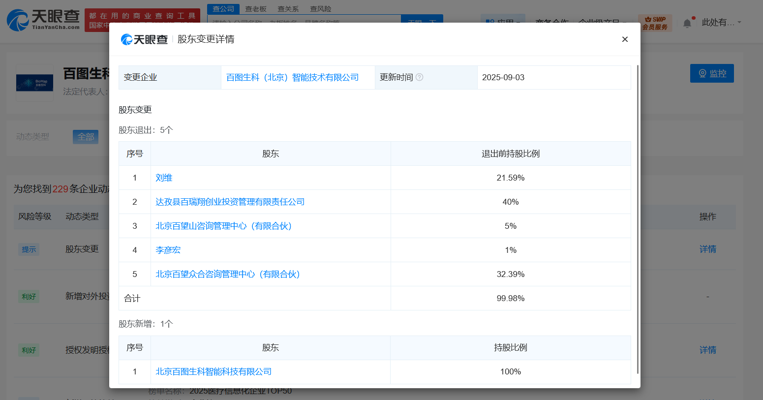 近日,百图生科(北京)智能技术有限公司发生工商变更,李彦宏、刘维、百度旗下达孜县百瑞翔创业投资管理有限责任公司、北京百望众合咨询管理中心(有限合伙)等退出股东行列,新增北京百图生科智能科技有限公司为股东并全资持股。