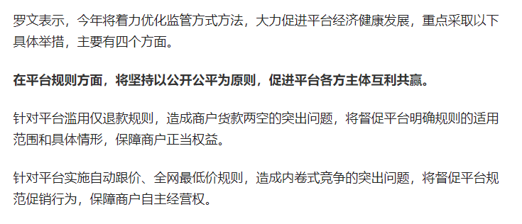其实早在两会首场“部长通道”上,国家市场监督管理总局局长罗文就曾提到:“要求平台取消自动跟价功能,防止恶性价格战挤压商户利润空间,保障中小经营者自主定价权”。