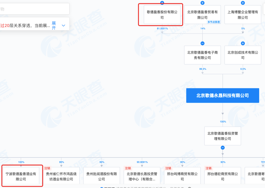 根据工商信息,宁波歌德盈香酒业有限公司由北京歌德盈香投资管理有限公司100%控股,层层股权穿透之后,该公司隶属于歌德盈香股份有限公司。公开信息显示,歌德盈香是一家酒类流通企业,自称“净资产逾20亿元,年销售额近100亿元,品牌价值近300亿元”。