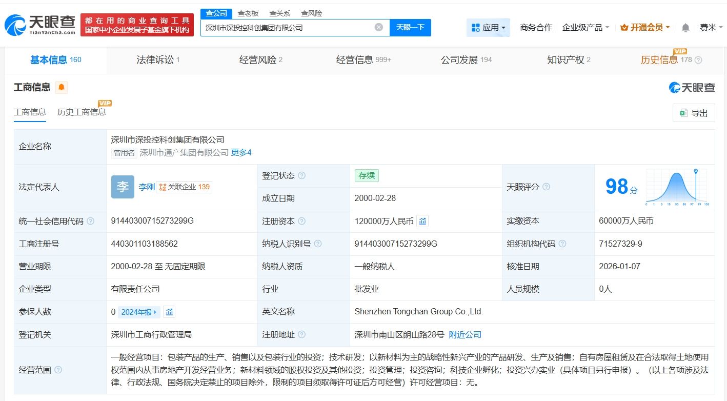 天眼查工商信息显示,近日,深圳市通产集团有限公司发生工商变更,企业名称变更为深圳市深投控科创集团有限公司,同时,注册资本由6亿人民币增至12亿人民币,增幅100%。