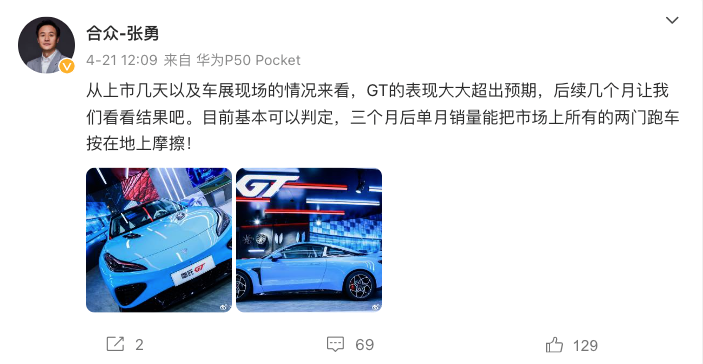 哪吒GT刚刚发布时,张勇就在微博上为新车造势,语气极为张狂。