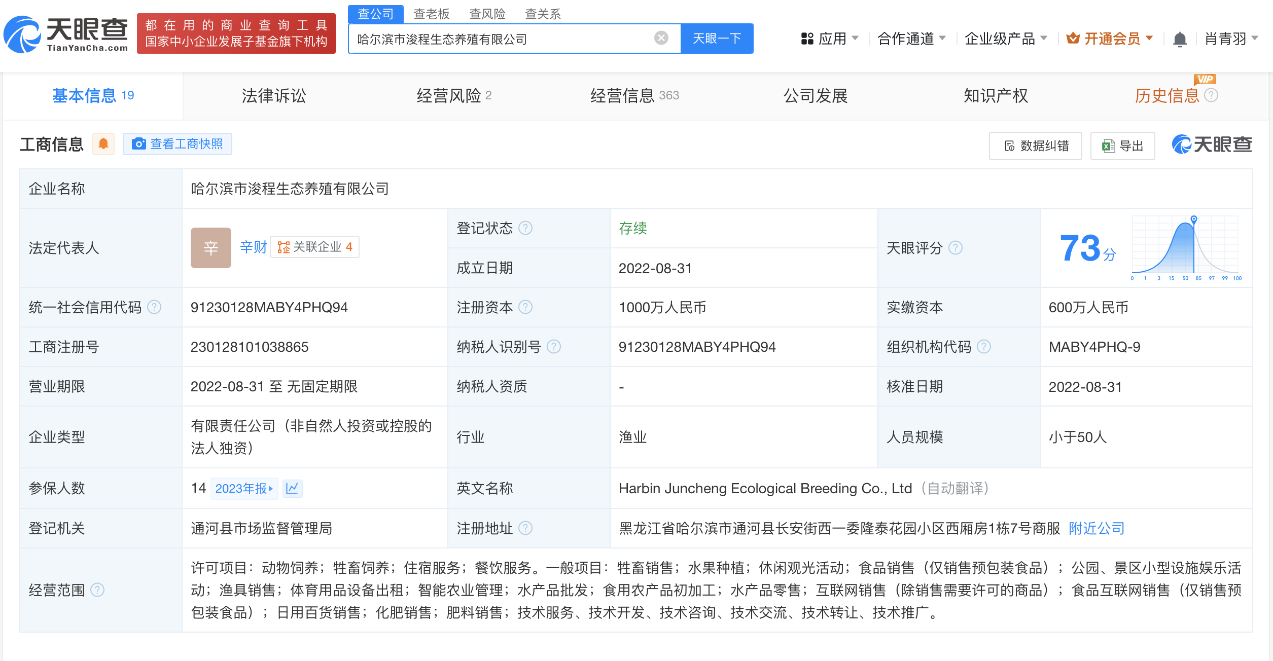 该公司成立于2022年8月,法定代表人为辛财,注册资本1000万人民币,经营范围包括动物饲养、牲畜饲养、智能农业管理、水产品批发、水产品零售、互联网销售、食品互联网销售等,由广州辛选供应链有限公司全资持股。最终受益人信息显示,辛有志(辛巴)为该公司实际控制人。