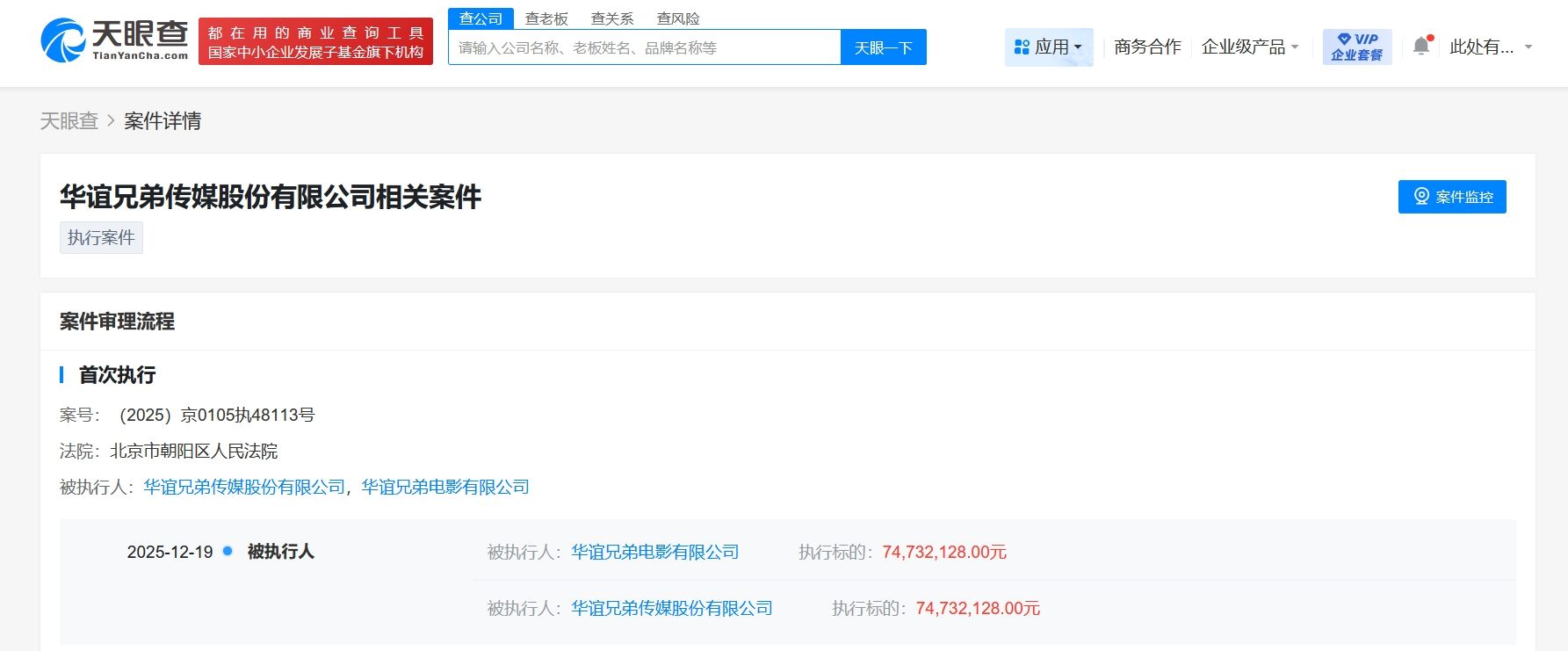 天眼查天眼风险信息显示,近日,华谊兄弟传媒股份有限公司、华谊兄弟电影有限公司新增一则被执行人信息,执行标的7473万余元,执行法院为北京市朝阳区人民法院。