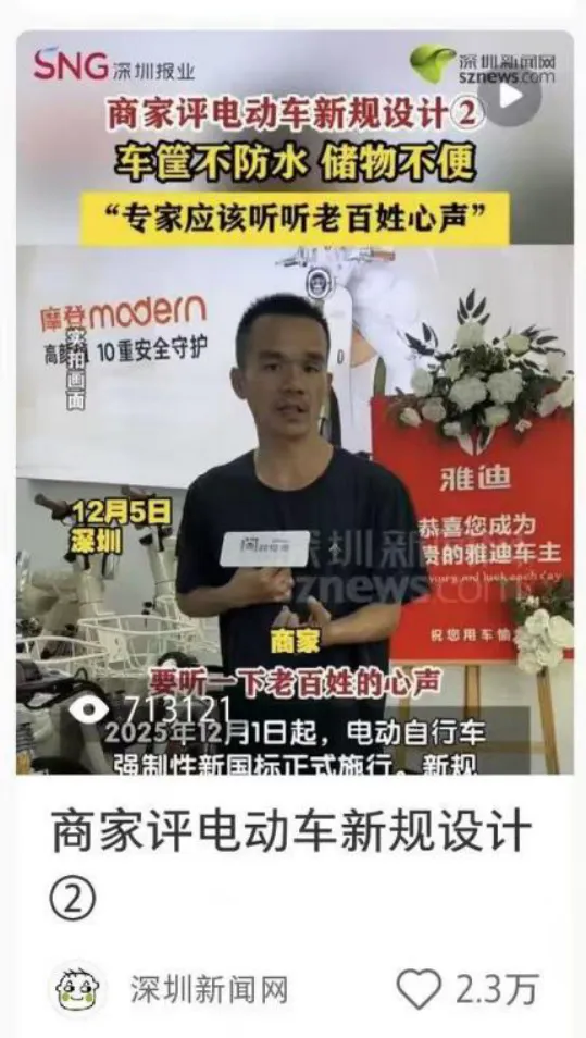 据报道,深圳新闻网的“小红书”官方账号12月6日发布了一条题为《商家评电动车新规设计:车筐不防水,储物不便,专家应该听听老百姓心声》的视频新闻,客观反映电动车新国标实施后存在的问题。