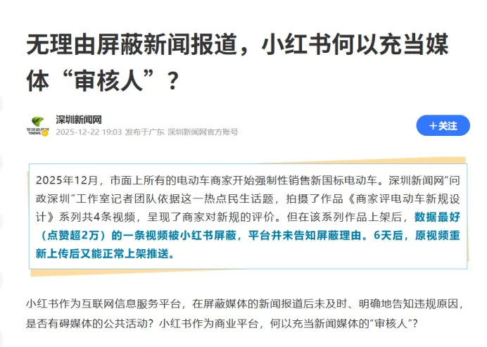 该视频获得2.3万关注,但在12月12日突然被平台屏蔽,且事前事后均未收到违规通知。更令人费解的是,当深圳新闻网团队当日尝试重新上传这条内容时,却又正常通过审核并对外展示了。深圳新闻网因此公开质问小红书:平台在未及时告知的情况下无理由屏蔽合规新闻,既缺乏明确判罚标准,又让媒体无法及时申诉,技术权力不应凌驾于公共价值之上。最终深圳新闻网严厉批评小红书妨碍了公共信息及时呈现,质疑其审核行为逾越了商业平台应有权限。