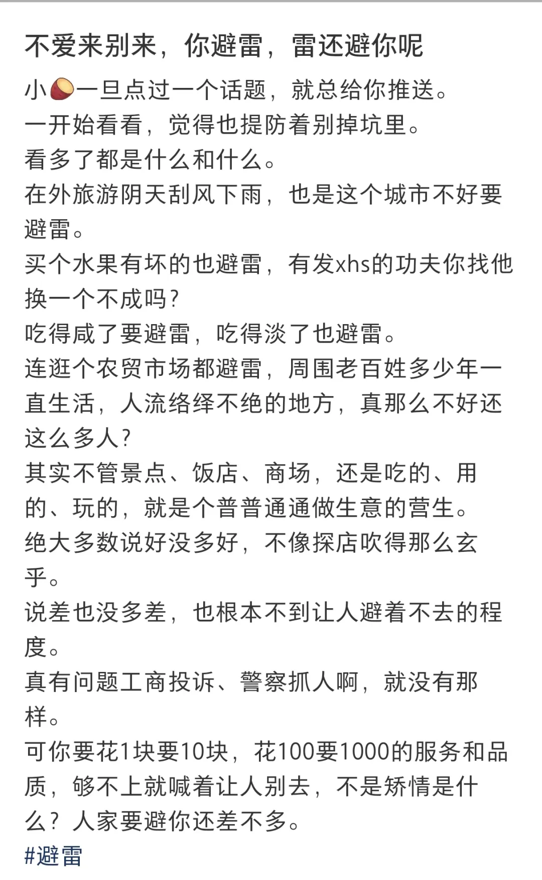 我们期待,在未来的旅游消费和电商环境中,少一些口诛笔伐的“避雷大战”,多一些理性建设性的沟通,让诚信经营者不再无辜“中雷”,让消费者的每一次发声都更有分量、更有价值。只有这样,“避雷帖”才能回归其应有之义。