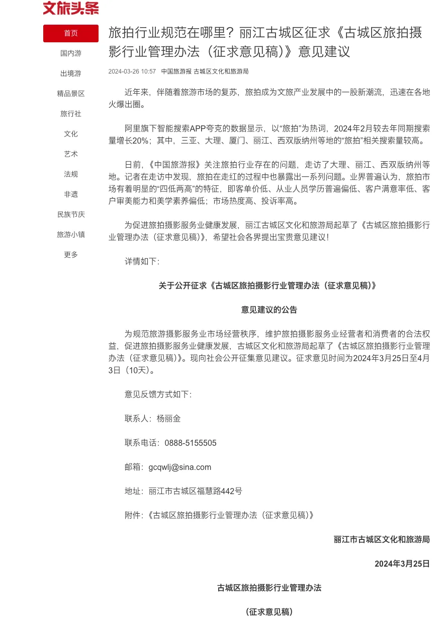 早在2024年,当地文旅局就曾发布《古城区旅拍行业管理办法(征求意见稿)》,要求旅拍商家明码标价、签订规范合同,将服务项目和收费标准全部写入合同,并严厉打击旅拍过程中的违法违规行为。