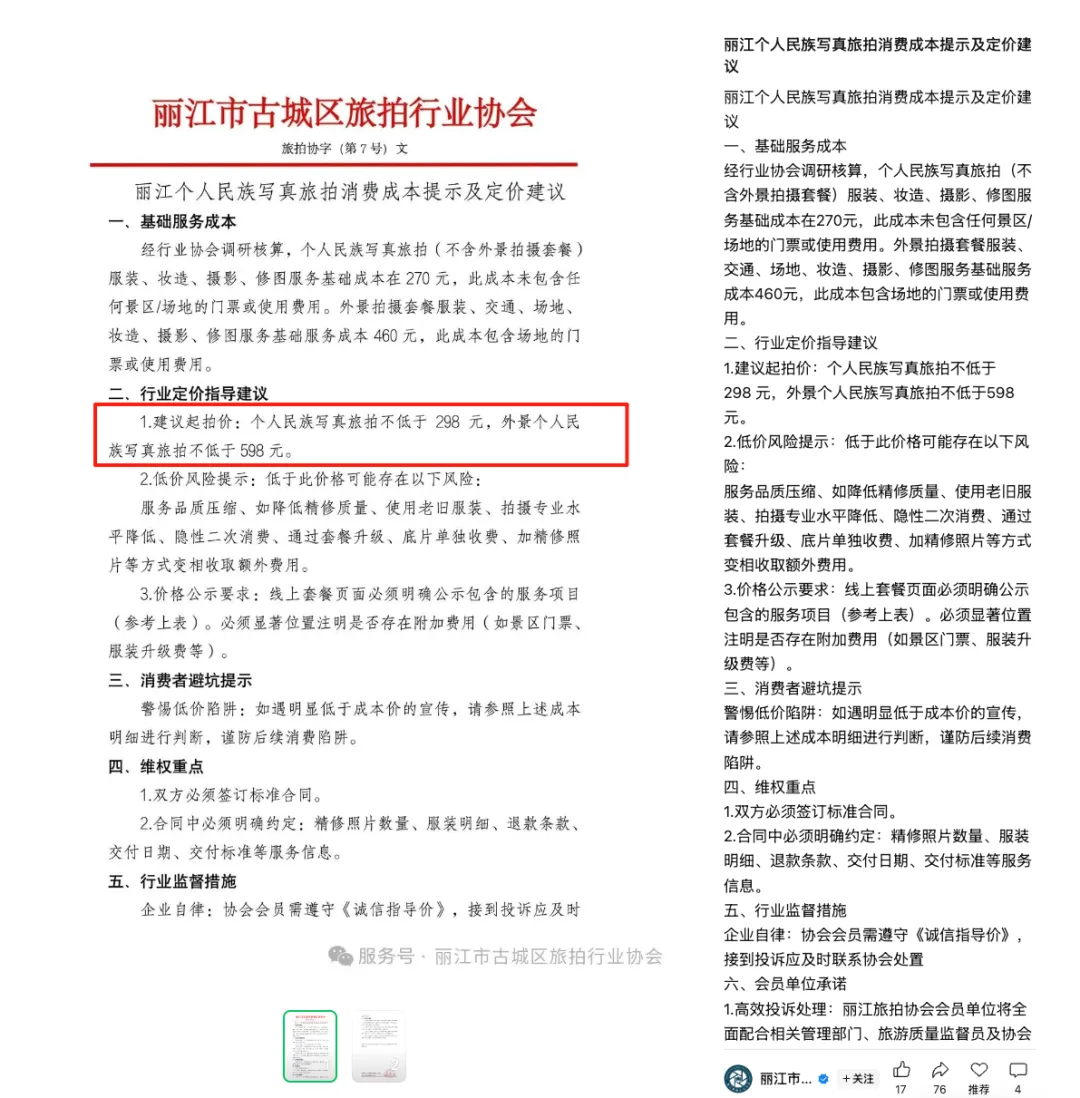 2024年7月,丽江市古城区旅拍行业协会也发布了《旅拍民族写真消费成本提示》,公开提示民族服饰写真类套餐的成本价不低于298元,外景个人民族写真旅拍不低于598元。呼吁游客理性消费、不要一味追求低价,同时要求各旅拍机构诚信经营,不得使用虚假或易误导的价格手段诱导交易。上述举措旨在遏制“低价诱客、高价宰客”的不良套路,从源头减少纠纷。