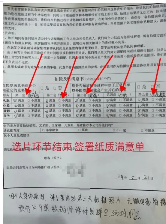 丽江旅拍行业协会提供的案例显示,一些“避雷帖”背后的消费者确实存在恶意行为。于涛监事长对九派新闻归纳了平台上不实避雷帖的几种典型情形:其一,消费者因个人原因违约(如非不可抗力的家人去世、怀孕等)要求退定金未果,便发帖抹黑商家;其二,在拍摄及化妆环节签字确认满意,之后冲动消费加购了更多精修,事后后悔为退款而恶意差评;其三,成品交付使用后,又以“看着不满意”为由要求全额退款,否则就发避雷帖;其四,有些人看到他人发帖成功退款后跟风效仿,即使自身没有合理依据也照搬手段要挟商家。