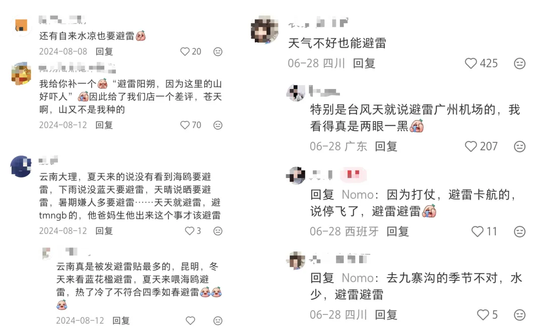 有网友表示“自来水凉要避雷”;“天气不好避雷”;“酒店不借厕所,避雷整座城市”,甚至“重庆楼梯太多也要避雷”……凡此种种,令人啼笑皆非。