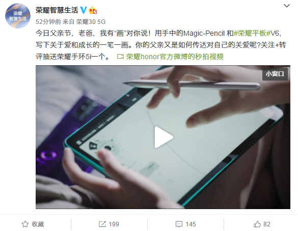 比如视频中女儿所用的荣耀平板V6和荣耀Magic-Pencil就可以让用户随时随地捕捉灵感,而荣耀平板V6则成了女儿和父亲之间交心的窗口,目前荣耀平板V6已有6GB+64GB和6GB+128GB两款Wi-Fi版可供选择。