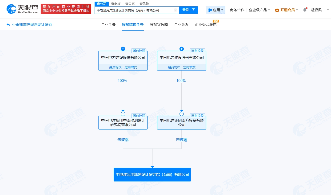 天眼查App显示,近日,中电建海洋规划设计研究院(海南)有限公司成立,法定代表人为张宗刚,注册资本5000万人民币,经营范围包括建设工程设计、建设工程勘察、安全评价业务、地质灾害治理工程勘查等。股权全景穿透图显示,该公司由中国电建(601669)旗下中国电建集团南方投资有限公司、中国电建集团中南勘测设计研究院有限公司共同持股。