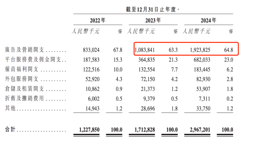 在成本方面,销售费用的急剧攀升尤为引人关注。2022年至2024年,销售费用分别为12.28亿元、17.13亿元、29.67亿元。2024年销售费用同比暴涨了73.23%。这主要源于广告及营销开支的急速增长,开支从2023年的10.84亿元激增至2024年的19.24亿元,同比增长77.5%,占到了当年总营收的16%。
