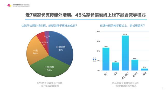 正所谓取长补短!如此看来,只有线上与线下深度融合的双师模式,才是符合教育机构长期发展战略。除此之外,从用户角度看,2018年智课教育与新浪教育联合发布的《中国家长教育焦虑指数调查报告》中显示,新一代家长中45%偏爱线上线下融合教学模式,成为最受欢迎的教学模式。(如下图所示)