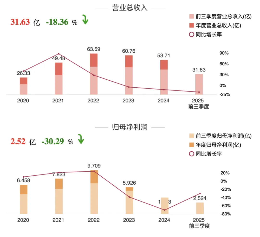对比2022年巅峰时期63.59亿元的营收规模,2024年营收已降至53.71亿元,下降15.54%;2025年前三季度,公司实现营收31.6亿元,同比进一步下滑18.4%。净利润方面,归母净利润也由2022年的9.71亿元骤降至2024年的1.74亿元,大幅下降82.08%。