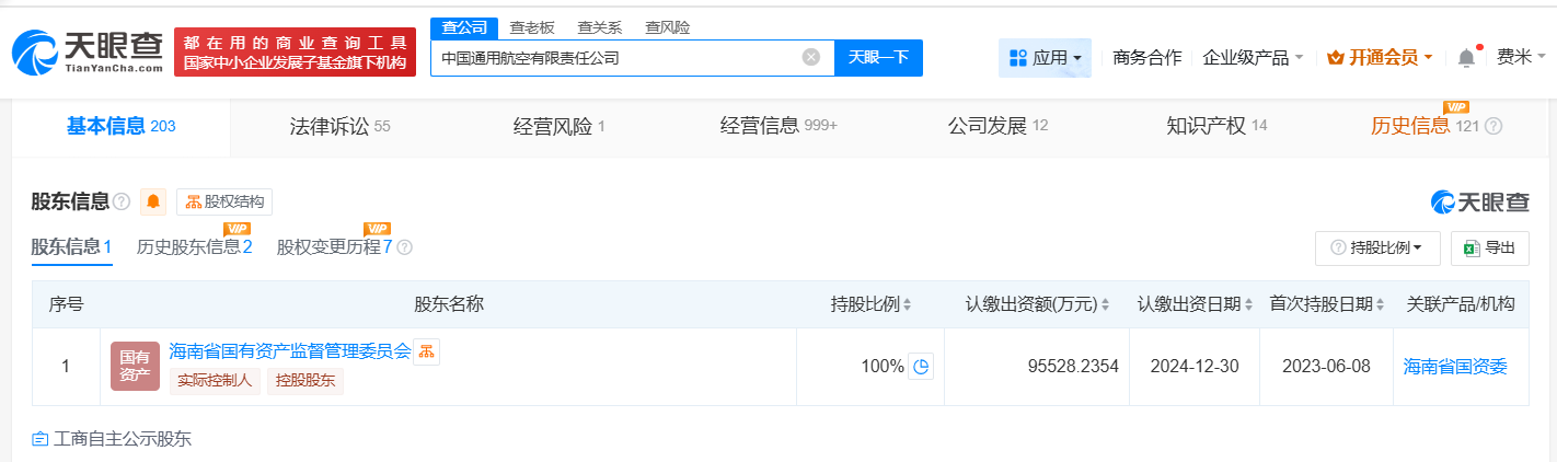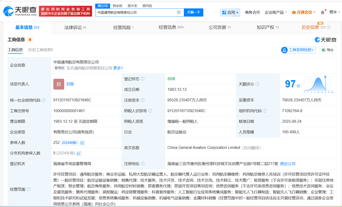 中国通用航空有限责任公司成立于1983年12月,法定代表人为刘昱,经营范围包括通用航空服务、民用航空器维修、民用航空维修人员培训等。股东信息显示,该公司由海南省国有资产监督管理委员会全资持股。