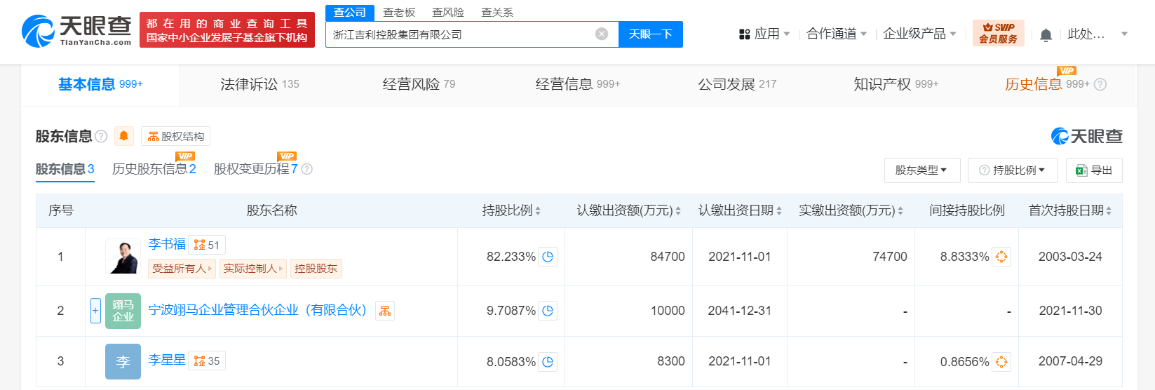浙江吉利控股集团有限公司成立于2003年3月,法定代表人为李东辉,注册资本10.3亿人民币,由李书福、宁波翊马企业管理合伙企业(有限合伙)、李星星共同持股。