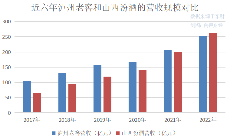 数据显示,在此前相当长的一段时间内,虽然泸州老窖的营收规模远不如洋河股份,但整体却也高于山西汾酒,位列行业第四的宝座。然而到了2022年,泸州老窖实现营收251.2亿元,低于洋河股份的301亿元,同时还低于在山西汾酒的262.1亿元,山西汾酒的营收规模实现了自2014年以来对泸州老窖的首次反超。