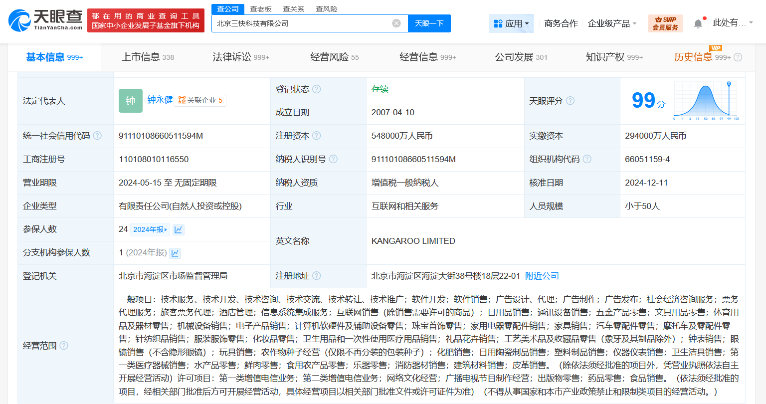 该公司成立于2007年4月,法定代表人为钟永健,注册资本约54.8亿人民币,经营范围含软件开发、软件销售、票务代理服务、旅客票务代理、酒店管理、信息系统集成服务、互联网销售、日用品销售等。股东信息显示,该公司由王兴、穆荣均共同持股。